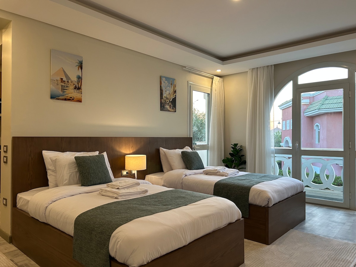 - If extra bed is needed we can add it for free. - You will be 2 mins away from Arkan Plaza, 5 mins away from Mall of Arabia, 8 mins away from Mall of Egypt. - You will be 15 mins from Pyramids of Giza and the Grand Egyptian Museum, and 25 mins away from the Nile river. - Bein Sports/SSC/Netflix - The pool is private and you can cover it or uncover it whenever you want. - The Villa is in a gated compound with 24 hrs security.
