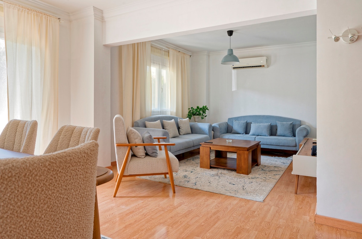 Stay in our stylish 3-bedroom apartment (110 sqm) designed in a soft industrial style. Features 1 queen bed, 4 single beds, a spacious living area with sofa, armchairs, coffee tables & a swing. Enjoy a fully equipped kitchen (fridge, stove, washer, filtered water), dining table for 6, and a modern bathroom with shower & hair dryer. Relax with a 55" Smart TV & free WiFi. Includes free parking. Perfect for families & groups seeking comfort and design.