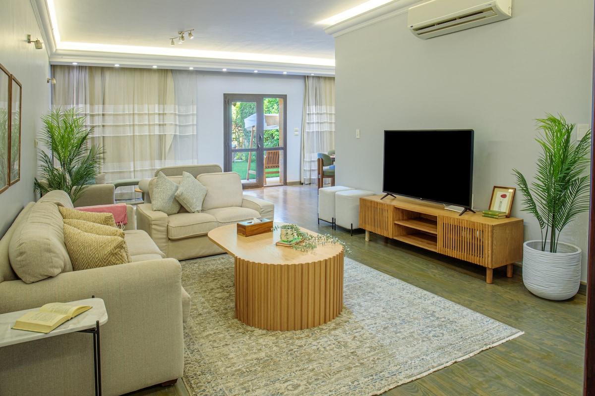 This unique place has a style all its own. A spacious 1-bedroom with a pull-out bed for guests & a full kitchen, on the ground floor with a luxurious backyard and private entrance in a secured compound. Near large malls and business parks in Central Zayed. The compound also has essentials like 24/7 security, gated access, and many nearby convenience stores that deliver. Just 25 min to the Pyramids, 15 to Smart Village, and 20 to the Grand Egyptian Museum.