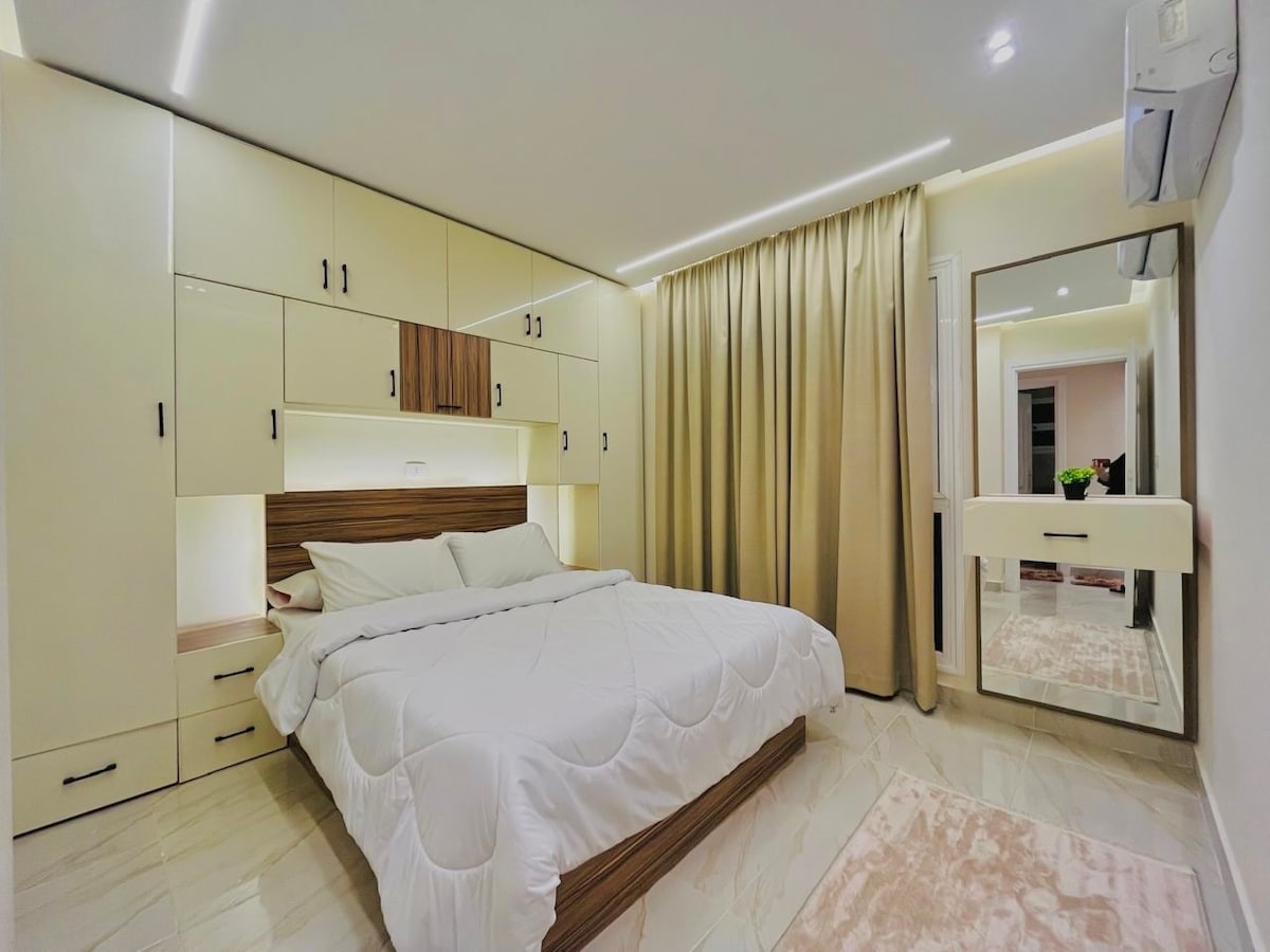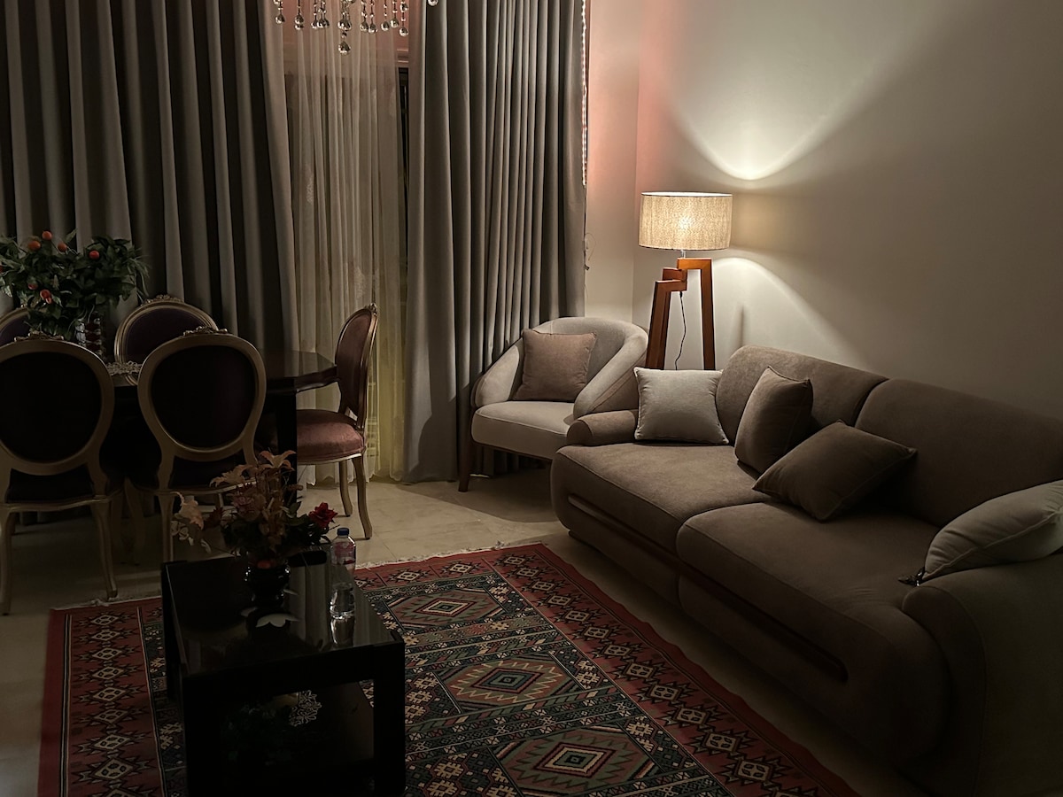 Stylish 2-bedroom apartment in Madinaty, fully air-conditioned with cozy bedrooms, a modern smart living room, high-speed Wi-Fi, and a flat-screen TV. Enjoy a private balcony with relaxing green views and a fully equipped kitchen with top appliances, perfect for cooking and dining. Ideal for families, business travelers, or weekend escapes. Located in a premium gated community with landscaped gardens, cafes, and 24/7 security for peace of mind
