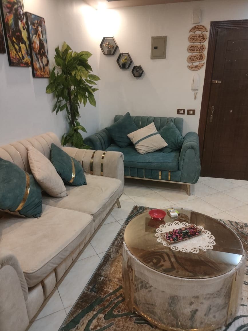 A cozy 2 bed rooms apartment on the ground floor, with 50 garden. Garden view. Totally new (2021 handover) with totally new classy furniture, appliances and air conditions located at B10 at madinaty, the latest stunning group with greenery everywhere and spacious parking Reception including sofa bed Dining table Bedroom 1 (Queen bed 160cm, wardrobe 200 cm, dresser, comod) Bedroom2 2 beds, 120cm, wardrobe 140 cm, comod. 1 rest rooms 1 kitchen garden 50