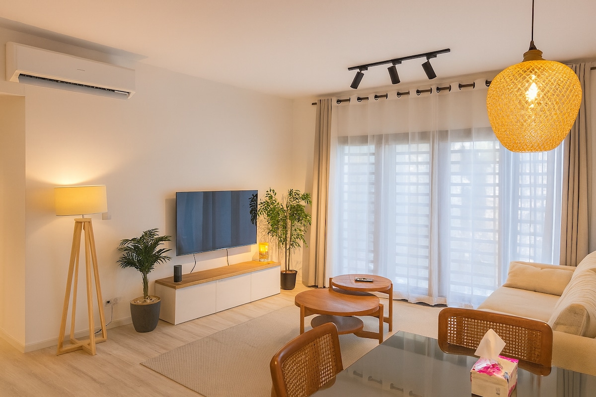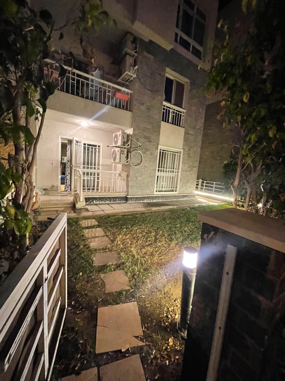 Modern 3BR apartment with a private garden & outdoor seating in Mountain View I-City, New Cairo. Furnished with premium furniture, luxury linens, 3 smart TVs, air-conditioning in every room, and a coffee machine. Master suite has private bathroom & dressing room. The compound offers shuttle buses to Madinaty & Rehab, sports courts, kids’ playgrounds, plus Starbucks, convenience store, and food stands on site.