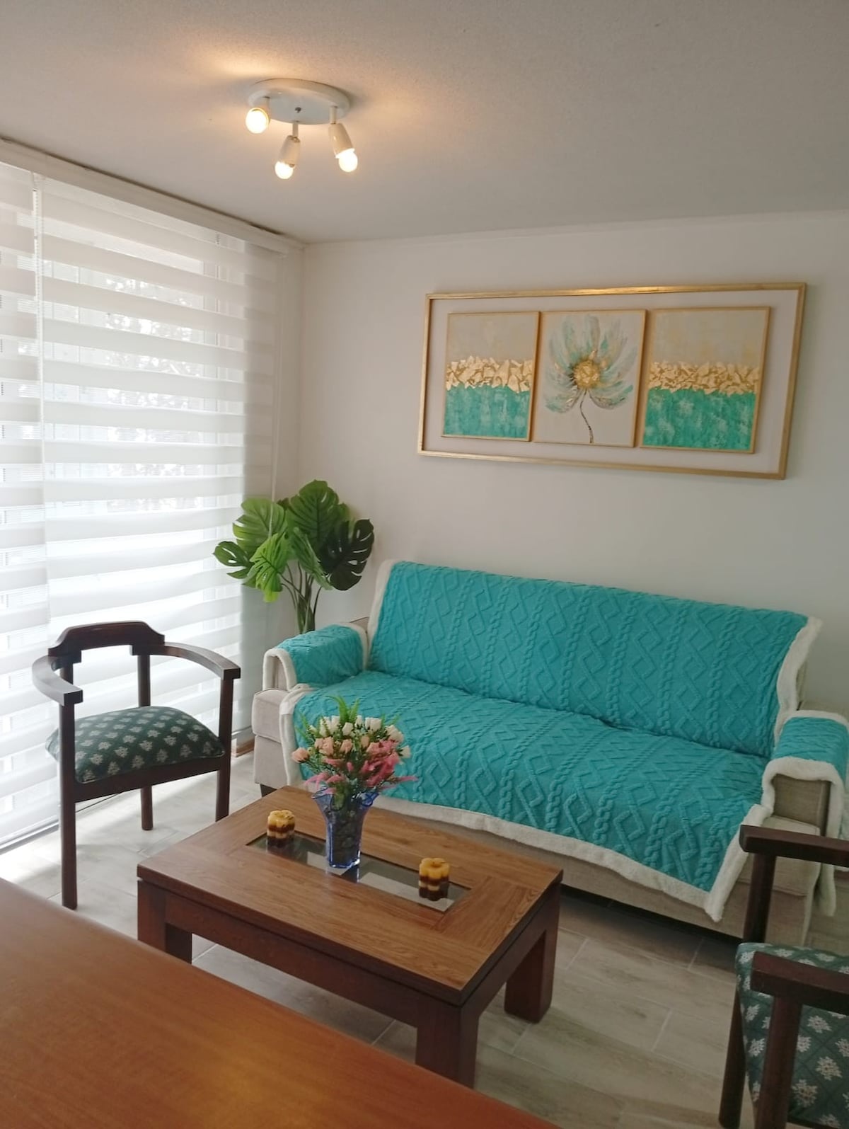 Es una casa donde sus dueños de Sergio y Marisol (un amable matrimonio) viven en el primer piso . El departamento privado disponible se ubica en el segundo piso de la casa; cuenta con un acceso independiente para los huéspedes. El departamento cuenta con 1 habitación con cama de 2 plazas más una sala de estar . Precioso baño privado, cocina americana (full equipada). Sábanas , toallas y secador de pelos. Excelente conexión Wifi con alta velocidad de : 800 Megabytes ( Mbps) y TV cable.