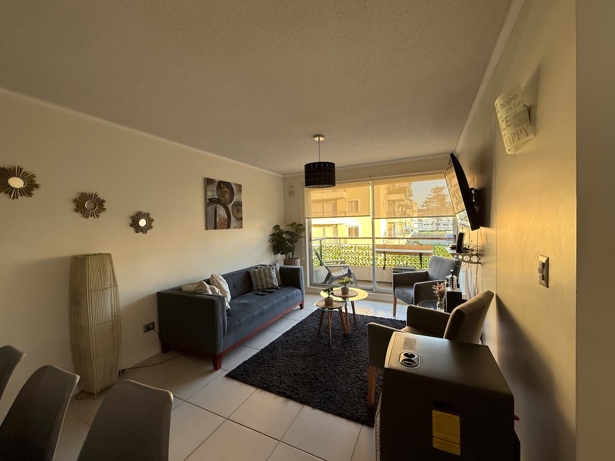 ¡Escápate a la tranquilidad de Algarrobo! Disfruta este moderno departamento, ideal para parejas, familias o teletrabajo. Ubicado en un exclusivo condominio, con acceso a piscina, quinchos y Hot Tub (cerrado temporalmente). A solo 3 minutos caminando de playa La Cueva del Pirata y 5 minutos en auto del centro. Incluye: • Terraza privada con parrilla a gas • WiFi rápido • Estacionamiento privado • Cocina equipada Rodeado de restaurantes, ideal para desconectar y disfrutar de la naturaleza.
