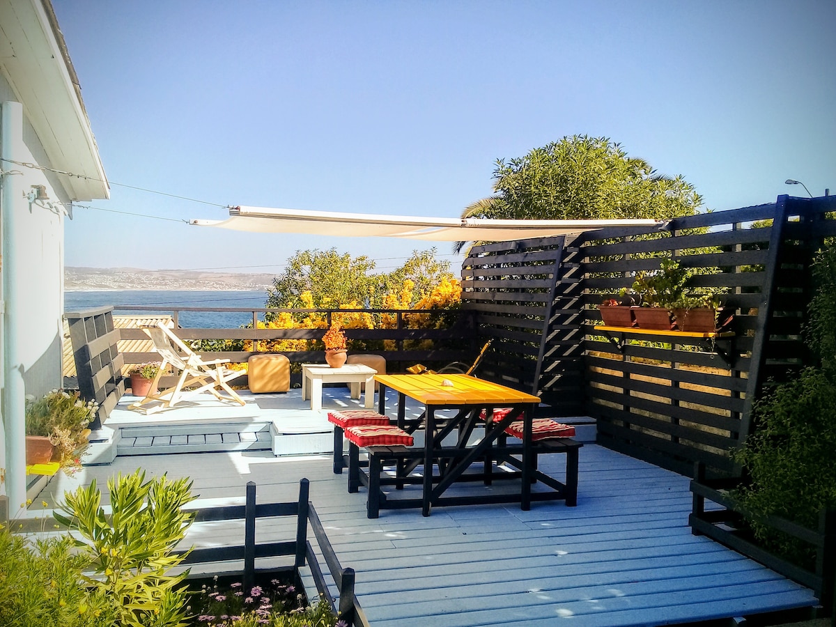 This modern style loft house has a great view in front of the ocean overlooking the beach and the Pablo Neruda museum. The house and the site offers privacy and at the same time easy access to the beach and the local commerce. One bedroom upstairs with a bathroom and a terrace. One bedroom downstairs. Spare bed for child available. Please note that the jacuzzi is not operational and that there is no central heating, only one radiator in each bedroom. The dishwasher is not working right now.