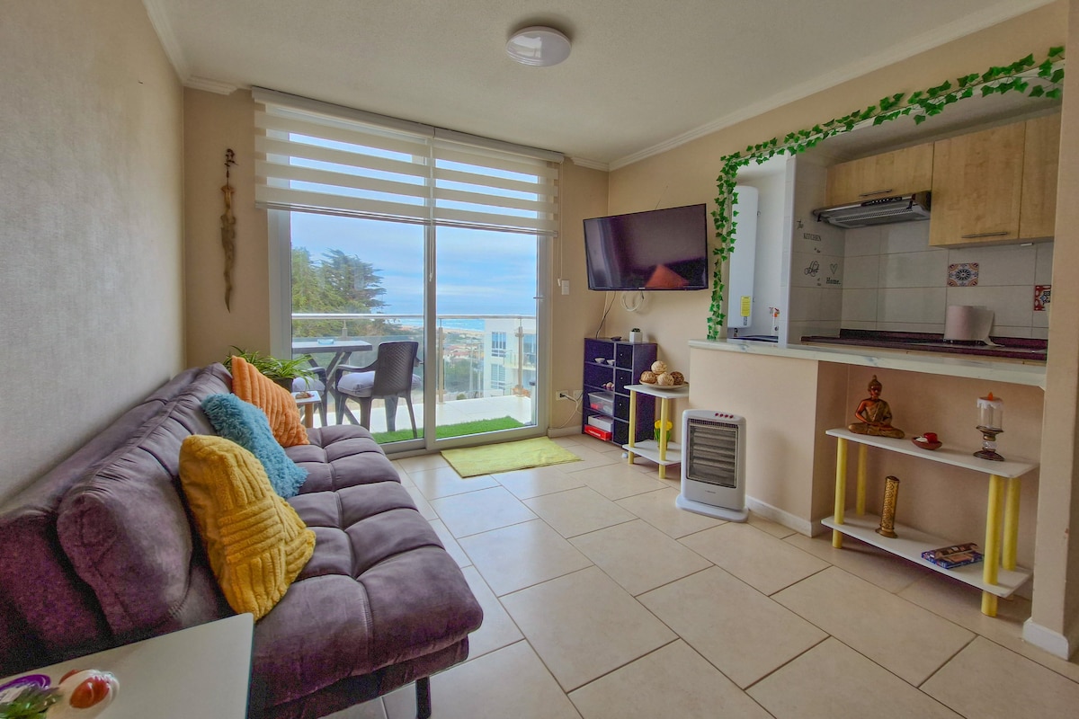 Hermoso departamento con una maravillosa vista al mar, con dos habitaciones, dos baños, cocina americana equipada. Cuenta con WIFI, las habitaciones y living con televisor y TV cable. Amplia terraza con impresionante vista al mar. Acceso directo a la playa y al lado de un bosque de pinos. Además hay un minimarket muy cerca. La tarifa no incluye sábanas ni toallas. Puedes traer las tuyas o, si te es más cómodo, puedes consultar por nuestro servicio de arriendo para la duración de tu estadía.