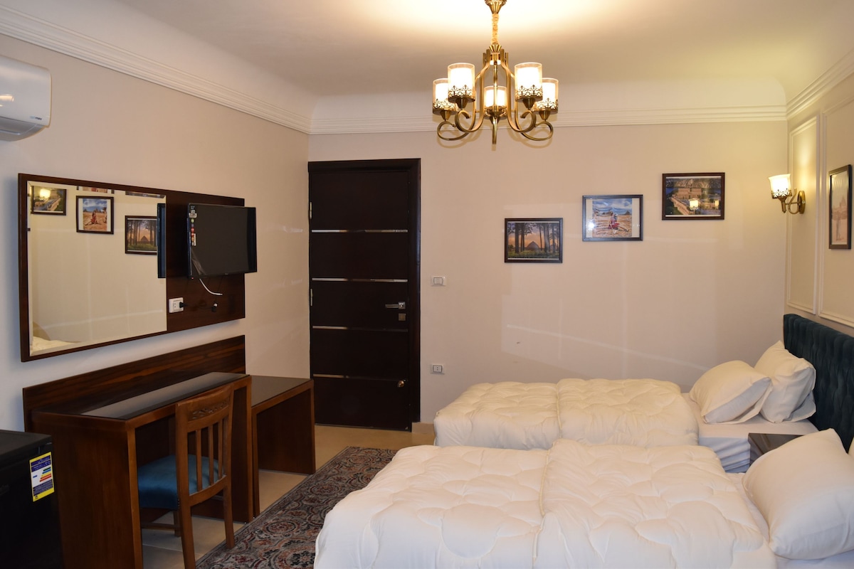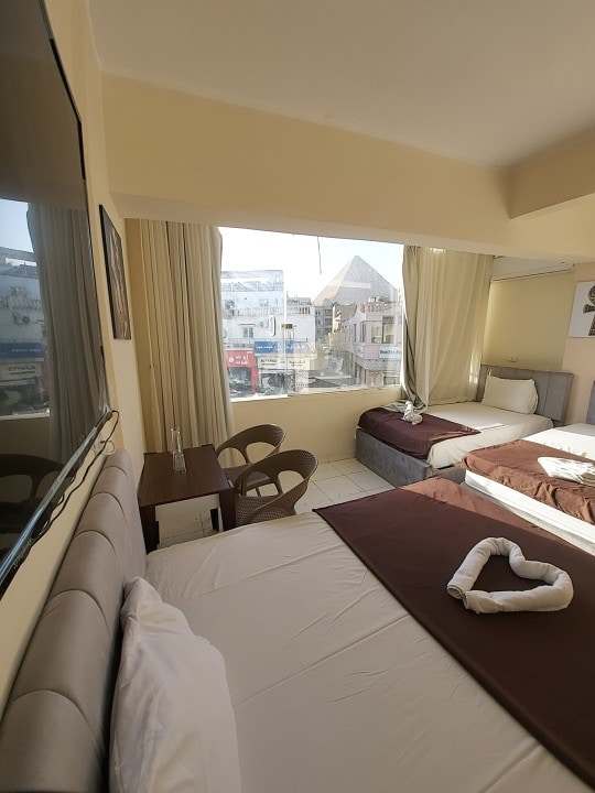 The room is about 21 square meters, everthing in the room is new and with high quality, and the general atmosphere in the room gives you a feeling of comfort, and the room has a private toilet and it's own heritage with pyramids view ( about 20 square meters), there is free internet service in the room also cold and hot air conditioning and a small refrigerator There is also a great heritage with pyramids view where can eat food and drinks, enjoy the sun during looking at the pyramids