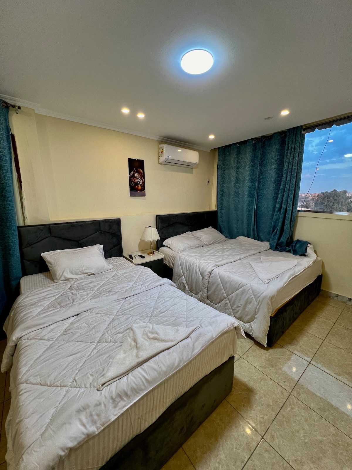The room is located on our 2th floor and is one of newly refurbished rooms. Guests will enjoy staying in beautifully designed, Egyptian themed room with a 1Double bed,Queen bed and Pyramids View from the rooftop!There is a coffee/tea station with complimentary water. This is a family ran business, and when you are here, you are family. Anything you need, let us know. Every room has its private bathroom.