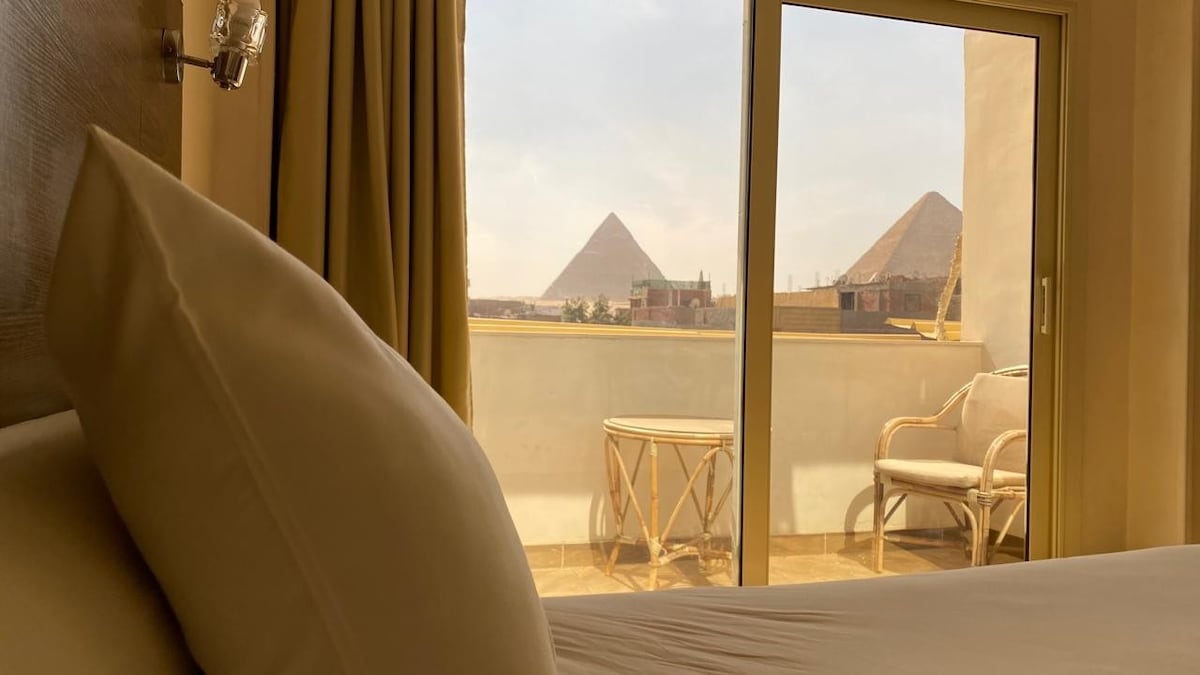 The room is about 21 square meters, everthing in the room is new and with high quality, and the general atmosphere in the room gives you a feeling of comfort, and the room has a private toilet and it's own heritage with pyramids view ( about 20 square meters), there is free internet service in the room also cold and hot air conditioning and a small refrigerator There is also a great heritage with pyramids view where can eat food and drinks, enjoy the sun during looking at the pyramids