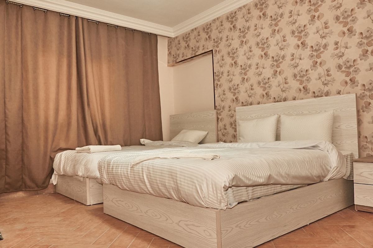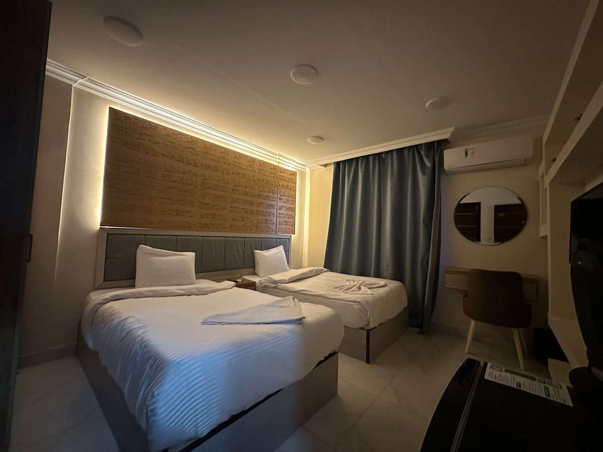 Wake up to stunning views of the Grand Egyptian Museum in this cozy, sunlit twin room. Enjoy a delicious traditional Egyptian breakfast served to your room each morning. With modern amenities, comfy beds, and a peaceful atmosphere, it’s the perfect base for exploring Cairo and the Giza Pyramids. Fast Wi-Fi, A/C, and great local dining nearby. A unique stay with a view you won’t forget—book now and experience Egypt from your window!