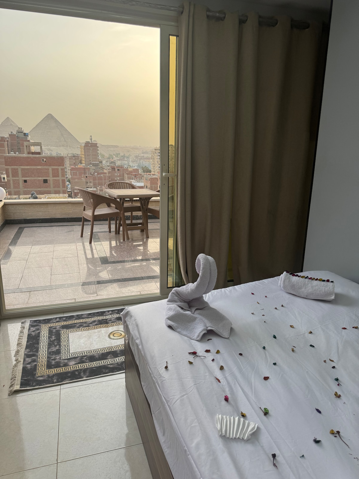 Pyramids of Giza and Sphinx (800 m), Great Egyptian Museum (2 km), Pyramid of Saqqara (15 km), Cairo Citadel (20 km), Pyramid of Dahshur (15 km). Room with: -1 bed (king-size) -Dressing table -Wardrobe -Bathroom with free toiletries -Mini-bar with kettle and cutlery -Large sun terrace -Free Wi-Fi -1 air conditioner -Breakfast ($5). Reservations from 7 days - Transfer from Aiport FREE! For Arabian people need a marriage contract.