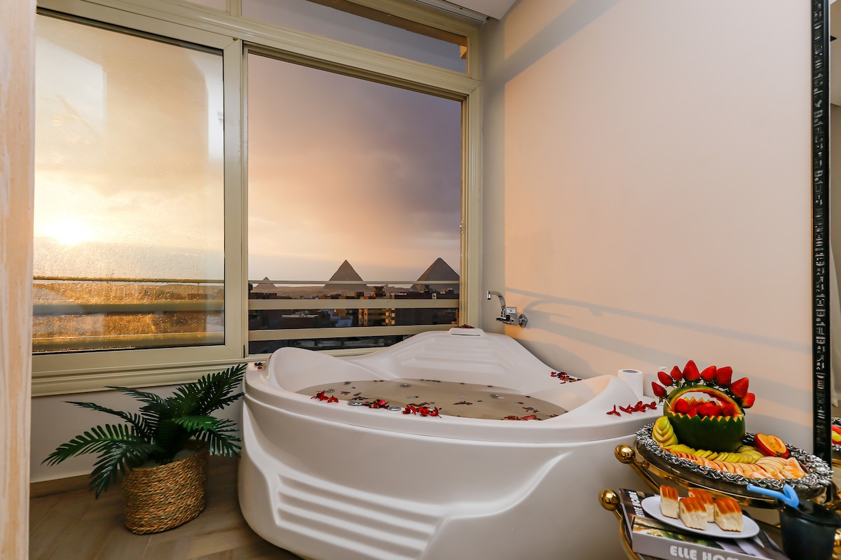 豪华酒店客房,带标志性金字塔景观和按摩浴缸