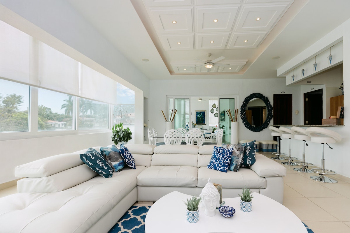 Unique 3-story beach house – one of a kind. 7 bedrooms, 13 beds, 8.5 baths. hot water. Every room with full bath -AC’s and ceiling fans in all rooms, separate laundry -Rooftop area pool, Jacuzzi, bar, BBQ(charcoal & gas) with amazing ocean view -High ceilings, large open kitchen and living area. -Spacious balcony for dining or relaxing. - 5 min. walk to the beach. -Parking for up to 7 cars - Base rate covers up to 4 guests, with a $40 charge per additional person, per night.