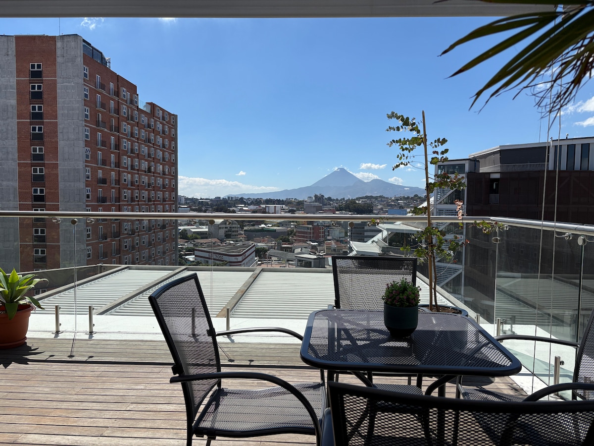 In this compact but well planned apartment you are in the centre of Guatemala City, close to everything. The apartment has a terrace with plenty of space for grilling/eating outside and a fully equipped kitchen. With one bedroom and a sofa bed the apartment fits up to three people. It is part of a modern complex with greenery. The complex additionally has a small coffee shop/bar on the ground floor and next-door a bar with one of the best craft beers from Guatemala.