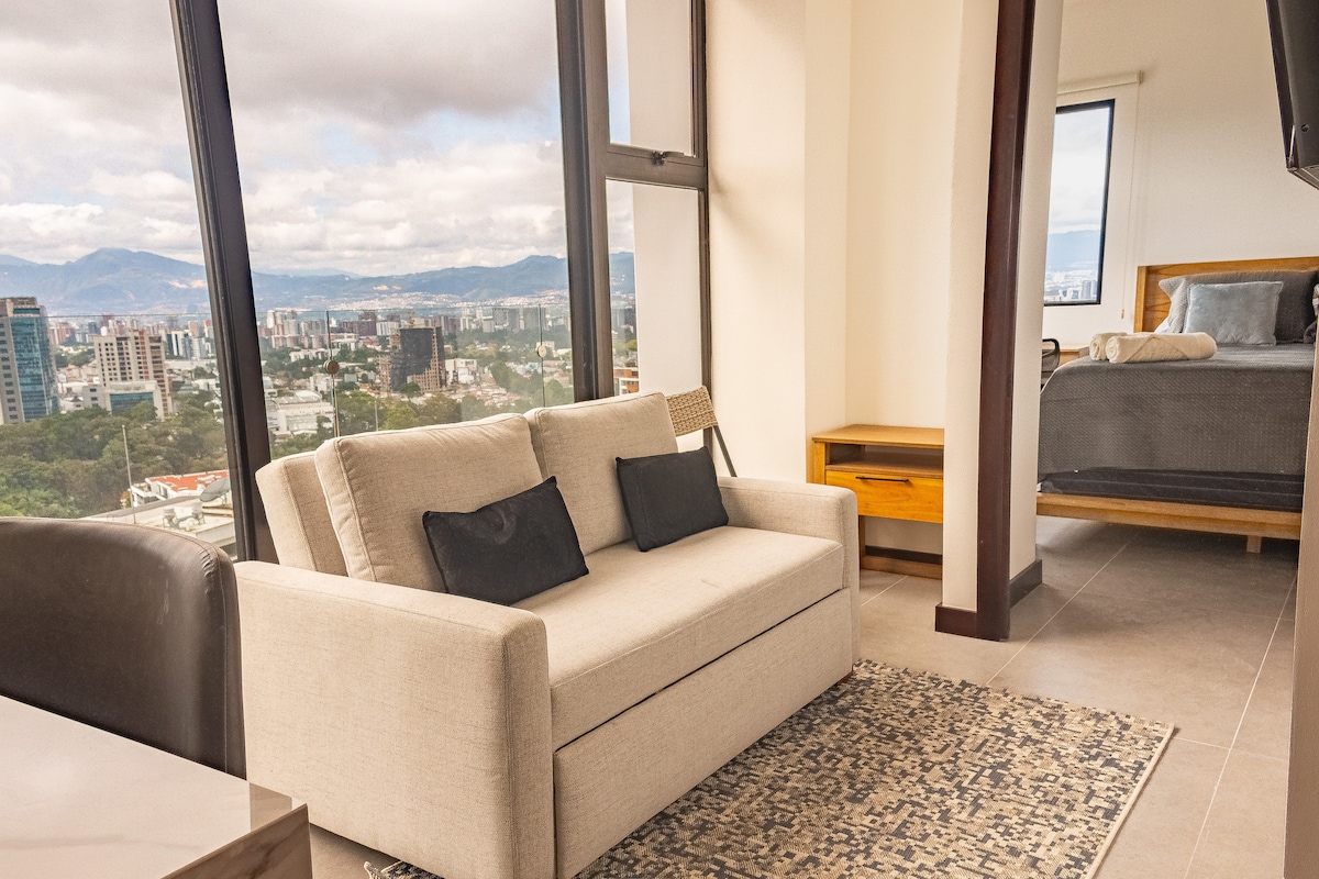 Imagine being surrounded by natural light in an elegant studio designed to reconnect with yourself. Located in the heart of Muxbal, this space offers seremity without disconnecting from the city. Perfect for travelers looking for more than just a place to sleep: here you'll find style, peace, and functionality. We feature panoramic walls with views of Guatemala City, the forests of Muxbal, and the iconic Agua, Fuego, Acatenango, and Pacaya volcanoes.