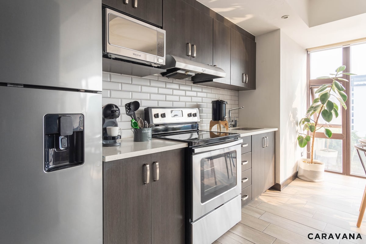Enjoy a spectacular view of the volcanoes from your private balcony in this cozy, modern studio. It’s fully equipped with high-quality amenities, from a comfy queen-size bed to a handy sofa bed for extra guests. With a fully equipped kitchen, and black out curtains, you’ll have everything you need for a relaxed and fun stay. It includes one parking space, on-site gym and access to the building’s convenience store. Just 8 minutes from the airport is the perfect place for you and your beloved