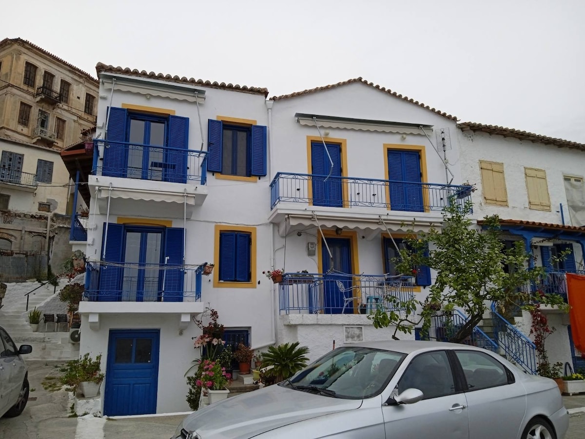 Πρόκειται για το παλιό μου πατρικό. Το σπίτι είναι φωτεινό και βαμμένο με ανοικτά χρώματα. Προσπαθώντας να διατηρήσω το παλιό του χαρακτήρα κράτησα κάποια έπιπλα-αντίκες, σερβίτσια ακόμα και ένα πολυέλαιο πάνω από το σαλονάκι των γονιών μου. Έχει στο πίσω μέρος του αυλή με κληματαριά και στο μπροστινό του μπαλκόνι υπέροχη θέα ακριβώς πάνω από τη θάλασσα.