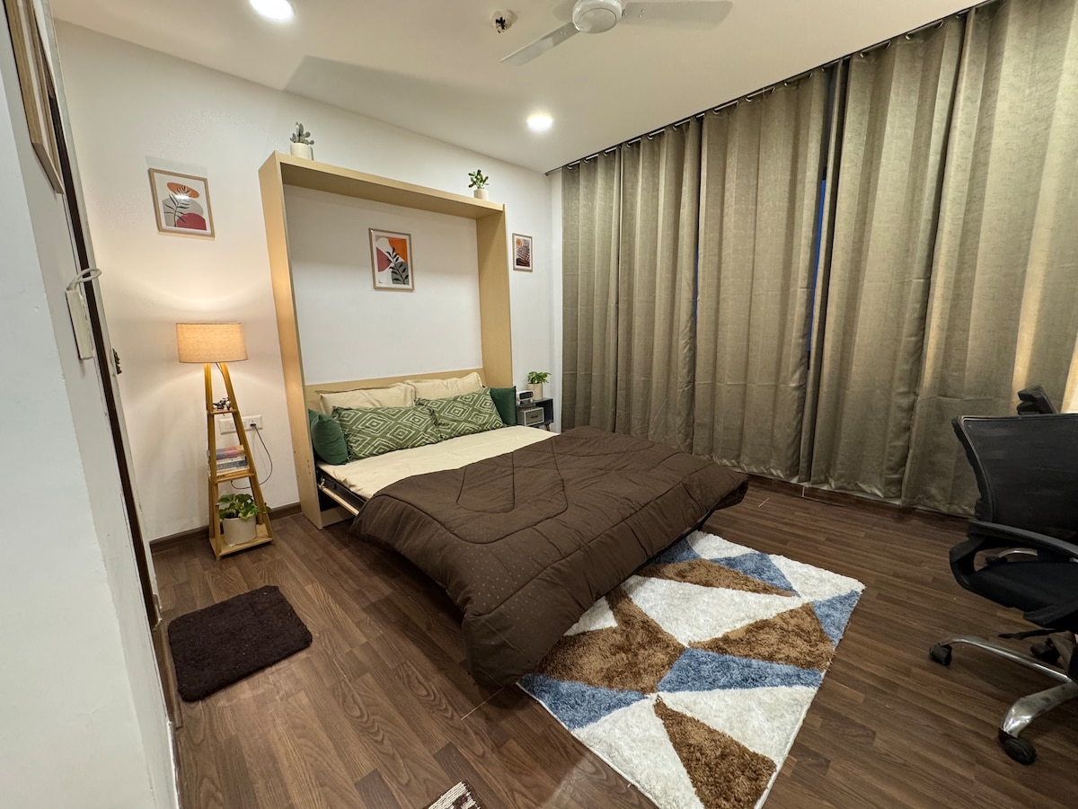 Step into a space where earthy charm meets modern comfort. Nestled in a peaceful, family-friendly gated neighborhood, 1 BHK apartment is designed for slow living, creative vibes, and warm hospitality. Located on the 2nd floor, the apartment is drenched in natural light and styled with a warm terracotta palette, the interiors are filled with handcrafted decor, rustic wooden textures, vintage finds, and original artworks thoughtfully chosen to make you feel instantly at home.