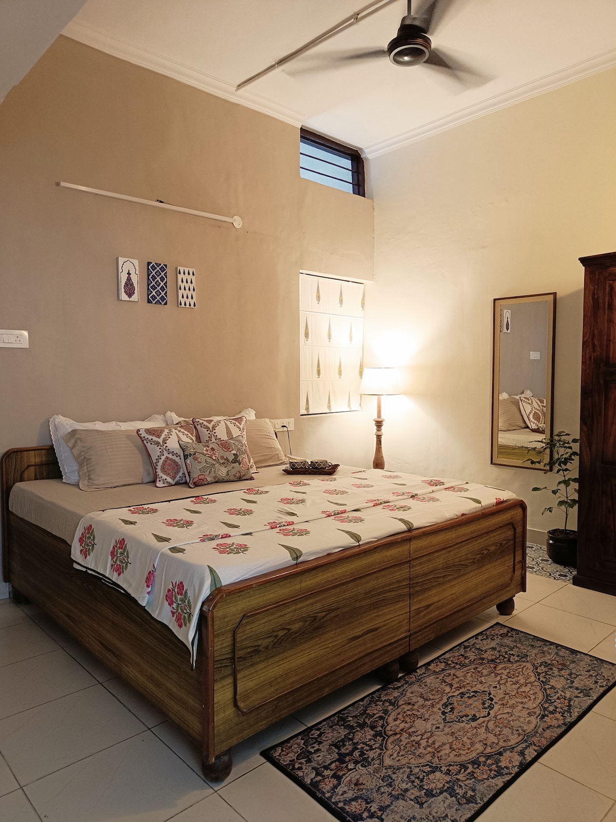 Unwind in a soulful, earthy haven in Chandigarh’s Sector 27. This ground floor home offers 2 well spaced bedrooms, a bathroom, a lounge-study, dining, kitchen & backyard. Curated by a host with 15+ years in design, branding & aesthetics, this home features hand-painted artworks by her. Centrally located, with parking & quick access to Elante, Sector 17 & fine dine restaurants at Sector 26.