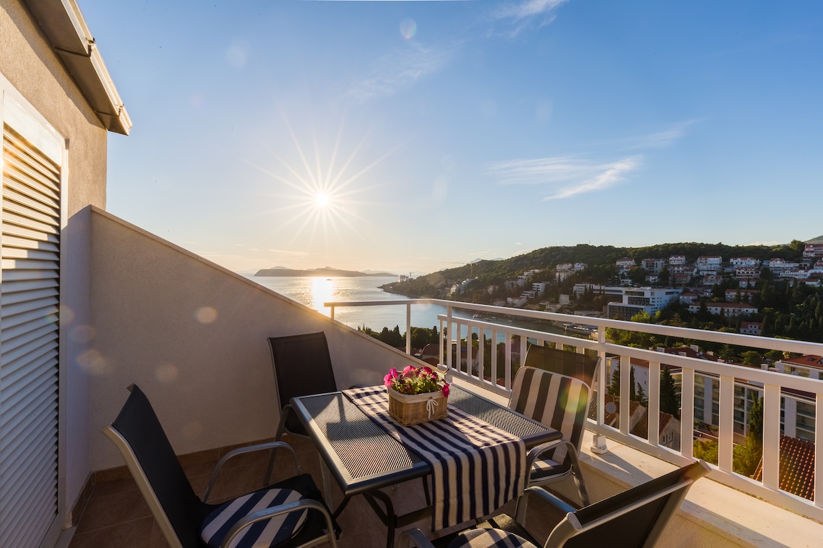 Comfortable and modern loft on perfect location, only few steps from the city walls and Ploče gate, with the most amazing views of the Old town, sea and the island of Lokrum. It consists of 2 double bedrooms, bathroom, toilet, fully equipped kitchen, office and specious dining and living room area with terrace overlooking magical roofs and Old port of Dubrovnik. Located just above the Old town in Ploče area, all major attractions and beaches are walking distance.