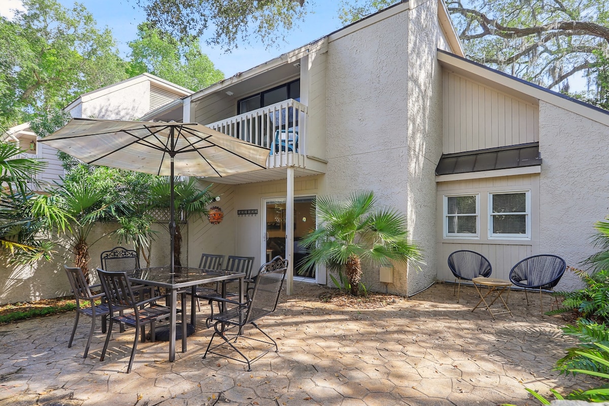 Welcome to our upper level end unit nestled in the gated Shipyard Plantation. After a day of exploring, golf, tennis, beach or shopping at Coligny Circle, the wrap around deck is a peaceful setting surrounded by lush low country foliage to wind down. Kids, keep an eye out for the occasional deer passing through. A short walk along a paved path lead directly to the beach. Saturday check in/out from April through August