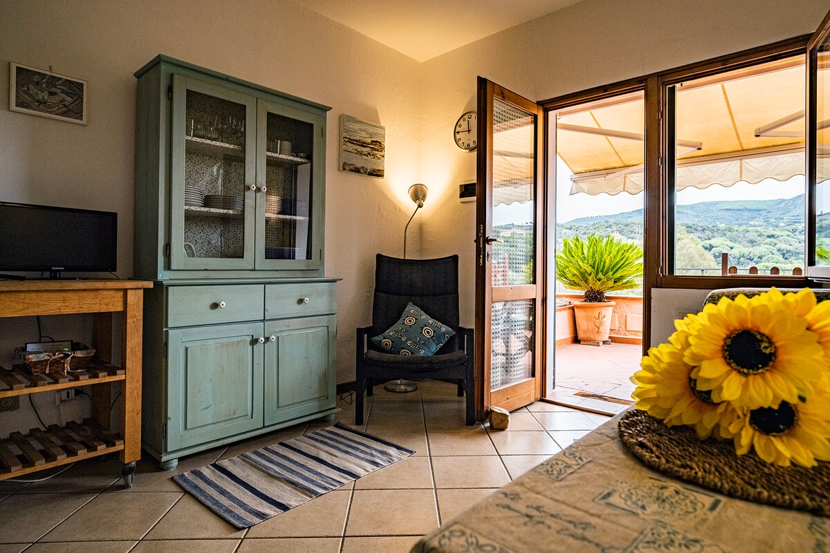 A cosy apartment overlooking the sea and the landscapes of Porto Azzurro bay. There is a large balcony with a sun awning giving shade in the warmest seasons. A peaceful area in the countryside with good local facilities. It's great out of season too for walking or cycling. Its a sunny apartment but very cool inside. In the winter months there is heating. The apartment is on the ground floor but has a few steps to reach the apartment from the car park. There is also free parking facilities.