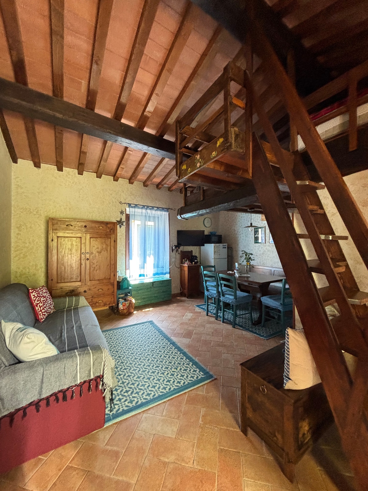 Bilocale indipendente di circa 30 mq da poco ristrutturato nei locali di una vecchia dimora contadina all’interno di un podere a pochi metri dalla casa principale. Soggiorno con angolo cottura, camera con letto matrimoniale e bagno. Piccolo spazio esterno ad uso esclusivo e posto auto scoperto. Stufa a legna nei mesi invernali. Immerso nella campagna dove è possibile ammirare varie specie vegetali e animali selvatici. Tavolino esterno. Comodo anche per lavorare un po’.