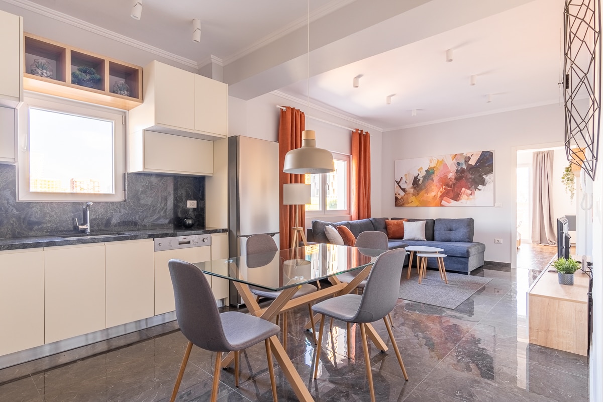 The apartment has been designed with simple, elegance to provide the ultimate comfort. It features large windows that fill the rooms with plenty of natural light and an amazing view from one of the new modern areas of Tirana. Designed in scandinavian style, the apartment has a large living and dining room with all amenities, a large comfy bedroom and a small relaxing room. Enjoy the time with your family and friends in this pleasant Penthouse.