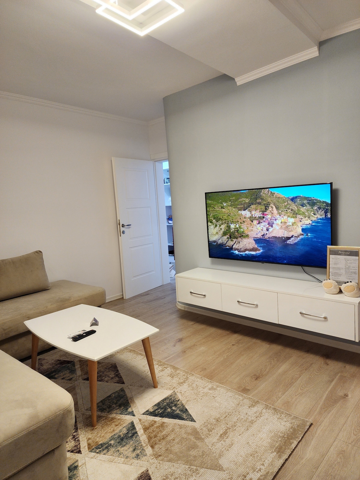 Welcome to our modern and cozy Airbnb apartment, located 5 min walk from city center! This spacious 75-square-meter retreat features one bedroom and walking closet , one full bathroom, an equipped kitchen, a comfortable living room, one balcony for you to enjoy the city’s sunrise and sunset. With its sleek design and ample space, including a dining area, it's the perfect home away from home for your stay in the heart of the city. No Pets, no smoking Can't wait to welcome you!