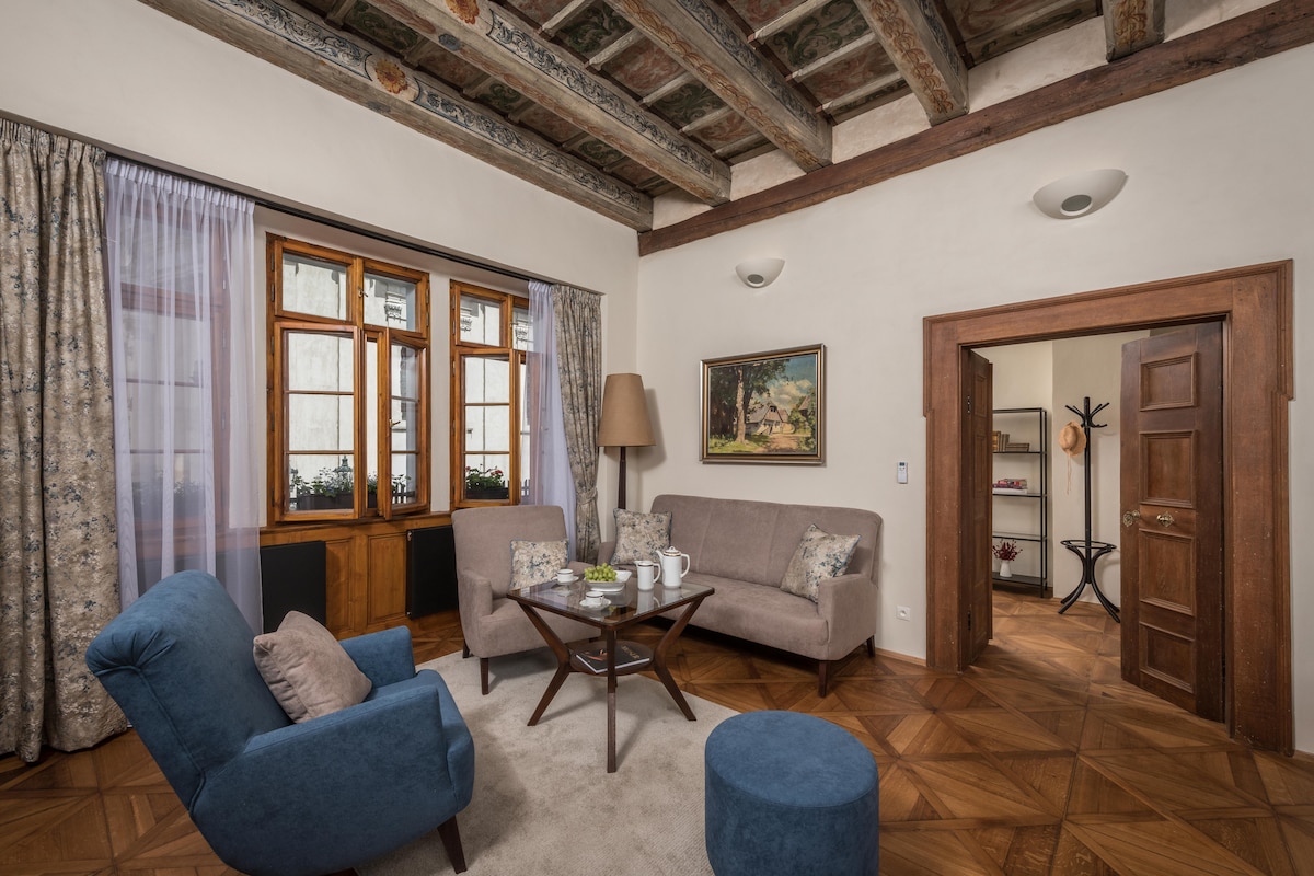 A beautifully reconstructed first fl two-bedroom flat in a 16th century building, the flat is just a wonderful few minutes walk to some of the most interesting sites in Prague, including, the Castle and The Charles Bridge. Cobble-stoned, gaslight, winding streets will charm you. Deep-set windows, thick walls contribute to the ancient romance of this flat. Stunning views of the Charles Bridge from the bedroom and castle from the living room will leave their mark long after you have checked out.