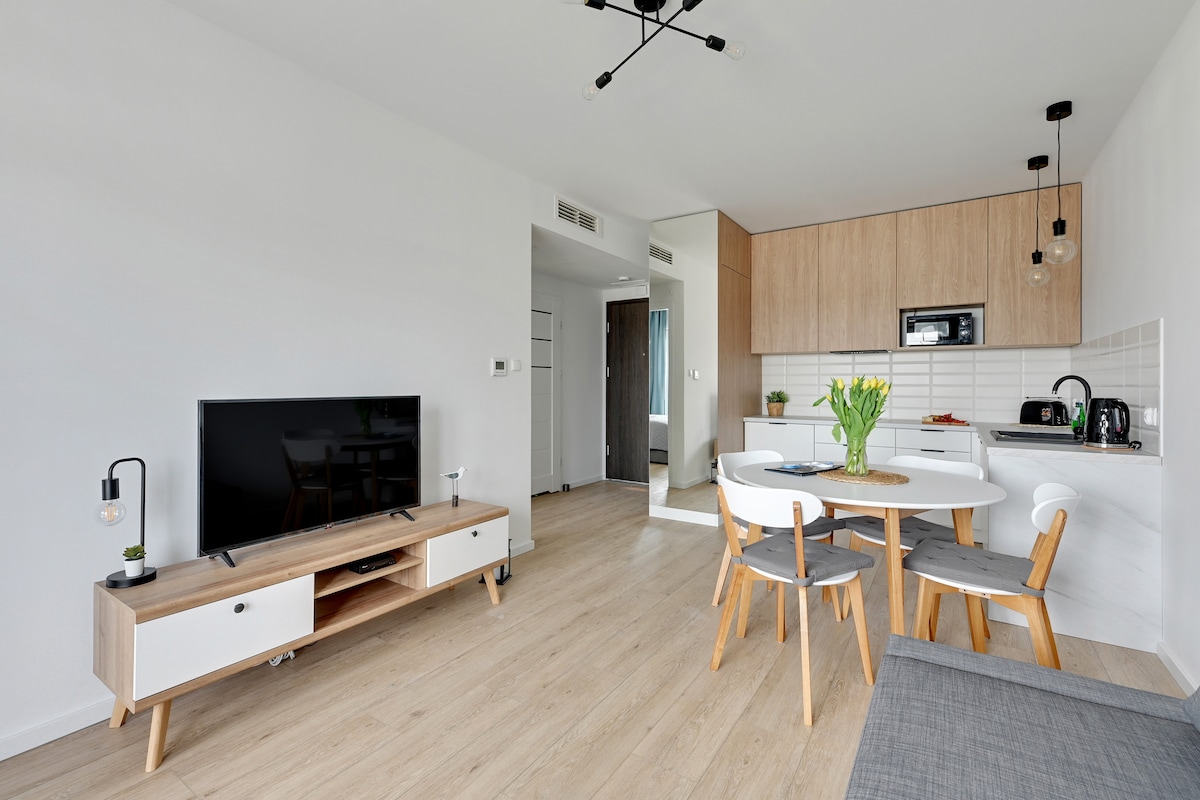 Nasz lokal składa się z salonu z aneksem kuchennym, sypialni i łazienki. Do dyspozycji gości oddajemy w pełni wyposażoną nowoczesną kuchnię, idealnie spełniającą wymagania nawet najbardziej wymagających. Salon z wygodną kanapą i TV pozwoli na chwile relaksu. Przestronna, elegancka, z dużym łóżkiem sypialnia, na pewno zadowoli niejednych z Państwa. Łazienka z przestronnym prysznicem, wygodną umywalką, pralką i szafką na przechowywanie, zachwyci swoją elegancją.