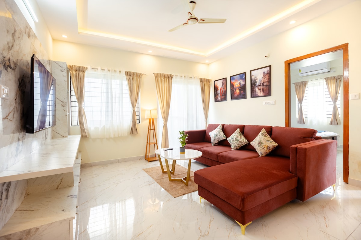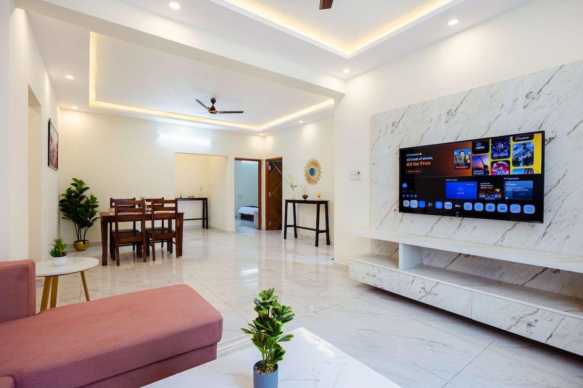 Welcome to this exquisite new 2 BHK home with 2 big balconies and FREE Parking a leisurely stroll to the IT hub, upscale shopping, Narayana hospitals 15 minutes in a luxurious fully furnished setup. Designed to emulate the ambiance of a villa and it features a cozy living room, live plants and an island modular kitchen with a breakfast counter. Enjoy high-speed internet, a 55" TV with access to Netflix, Amazon Prime. The master bedroom has a Samsung split air conditioner. WiFi connecti