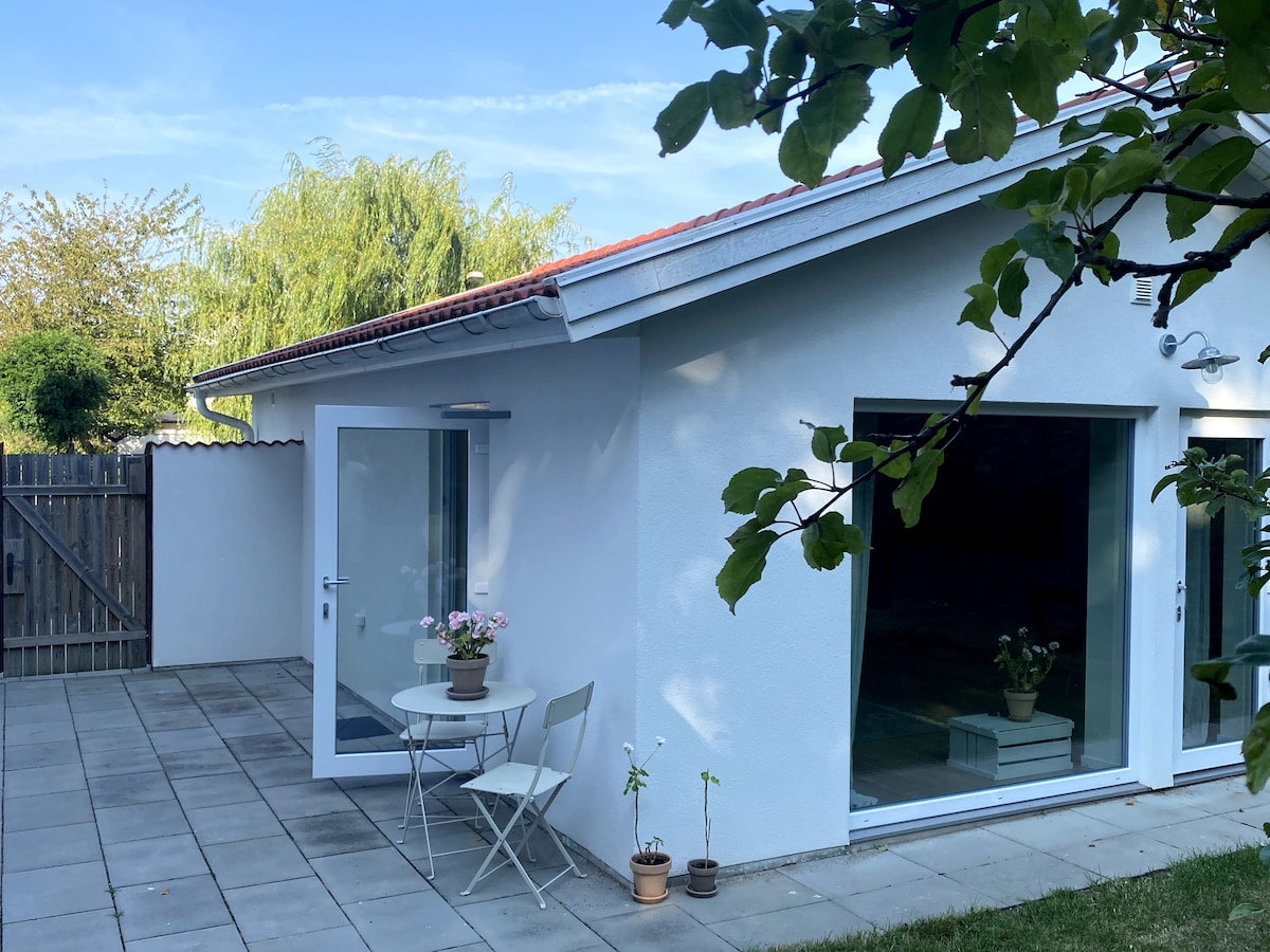 Fristående gästhus i lugnt område i västra Malmö, omgivet av grönska och med stora fönster som ger härligt ljus. Sovloft med dubbelsäng och bäddsoffa i vardagsrum, fullt utrustat kök, fräscht badrum och liten matplats. Uteplats med bord och stolar. Gratis parkering på gatan. Endast 5 min till havet och 10 min till stan med bil. Perfekt för par, små familjer eller vänner som vill bo lugnt men nära allt.