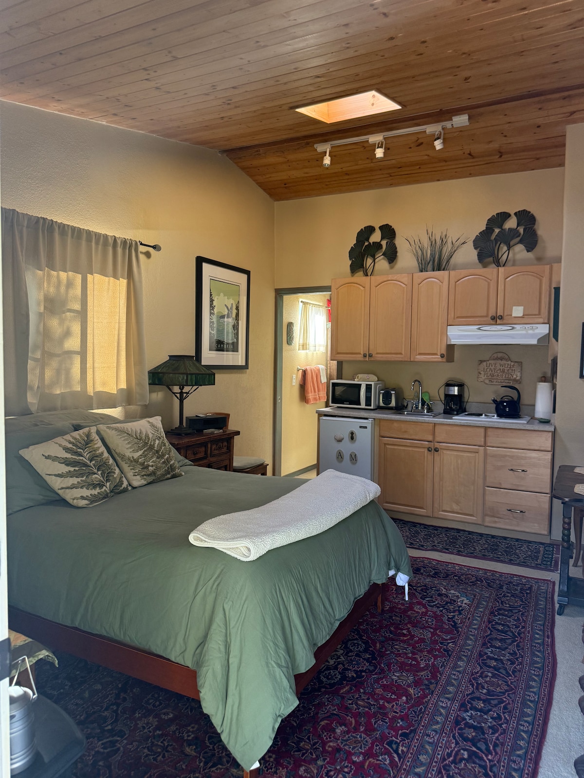Private, quiet above garage apartment with beautiful forest views. Access to forest trailhead that leads to ocean. Newly remodeled unit with handmade Cambria Pines counter tops. Cozy gas fireplace, three quarter bath with custom shower and cal king bed. Kitchen nook with small fridge, microwave, sink, coffee maker and hot water pot. Wifi available. Two night minimum.