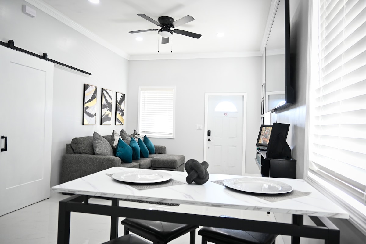 Experience Bahamian charm in this renovated home. Your room, one of two upstairs is above a coffee and gift shop, and is centrally located in Governors Harbour. Please note the potential for morning bustle from the shop! This spacious room features an en-suite bathroom and is just a short walk from restaurants, a grocery store, and a pink sands beach (1 mile away). On warm days, enjoy the shared pool and island breeze.