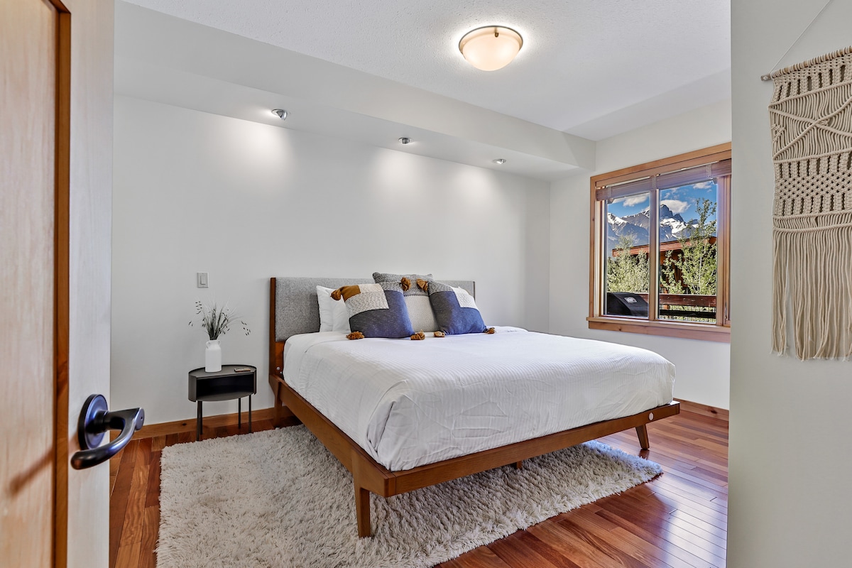 This luxurious, spacious bedroom suite with breathtaking mountain views will leave you feeling relaxed and with the perfect starting point for mountain adventures. The living space has large scenic windows, an open floor plan, luxury furniture, and a cozy fireplace. It is a 5-minute scenic walk to downtown's restaurants and shopping, a 5-min walk to numerous biking and hiking trails, and a 15-min drive to Banff National Park.