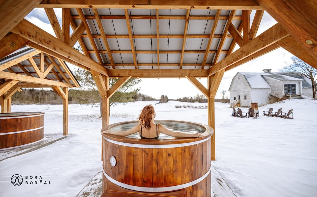 Floating Cabin — Minibora Le bolet (Maximum 4 Guests) A Bright and Inviting Living Space: - Glass garage door for an immersive waterfront experience - Fully equipped kitchen and private BBQ Sleeping Arrangements: - Open-concept bedroom with a double bed - Modular sofas: 2 single beds or 1 double bed Included: - Firewood - Locally roasted coffee - 11 Comtés craft beer - Paddleboards and kayaks in summer - Snowshoes in winter Dog-friendly (extra fee) CITQ: 302677