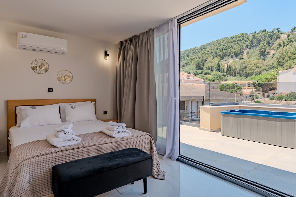 Charming one bedroom apartment with access to garden and BBQ area, in traditional Greek village. There is a small kitchenette/ lounge area with a table and chairs and two arm chairs that fold out into single beds. Guests will be greeted with breathtaking views, fresh country air and organic fruit from our trees.