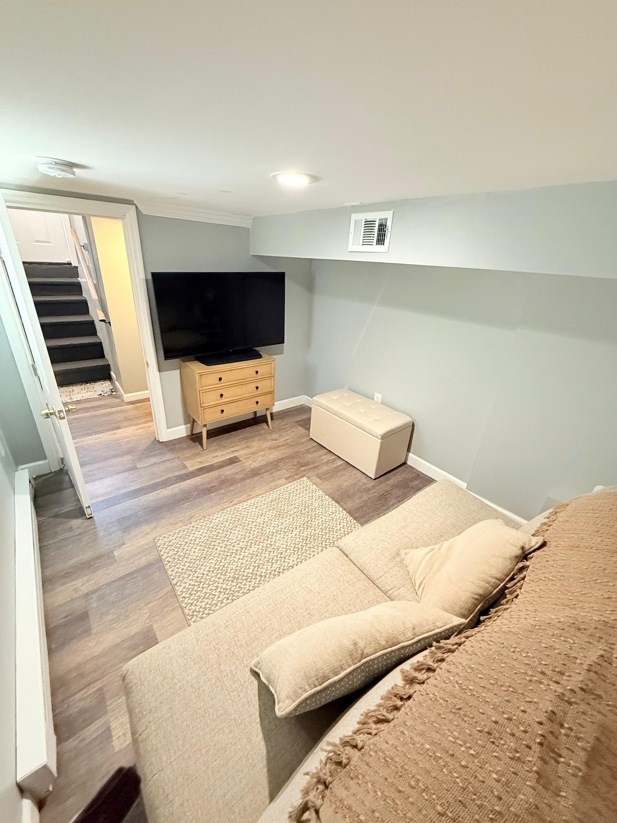 Welcome to your modern home away from home! This stylish 1-bedroom King bed apartment is located in a quiet, private building with only four units perfect for guests seeking a peaceful stay. Situated on the second floor (walk-up), the space features hardwood floors, a full bathroom, and sleek, minimalist decor.