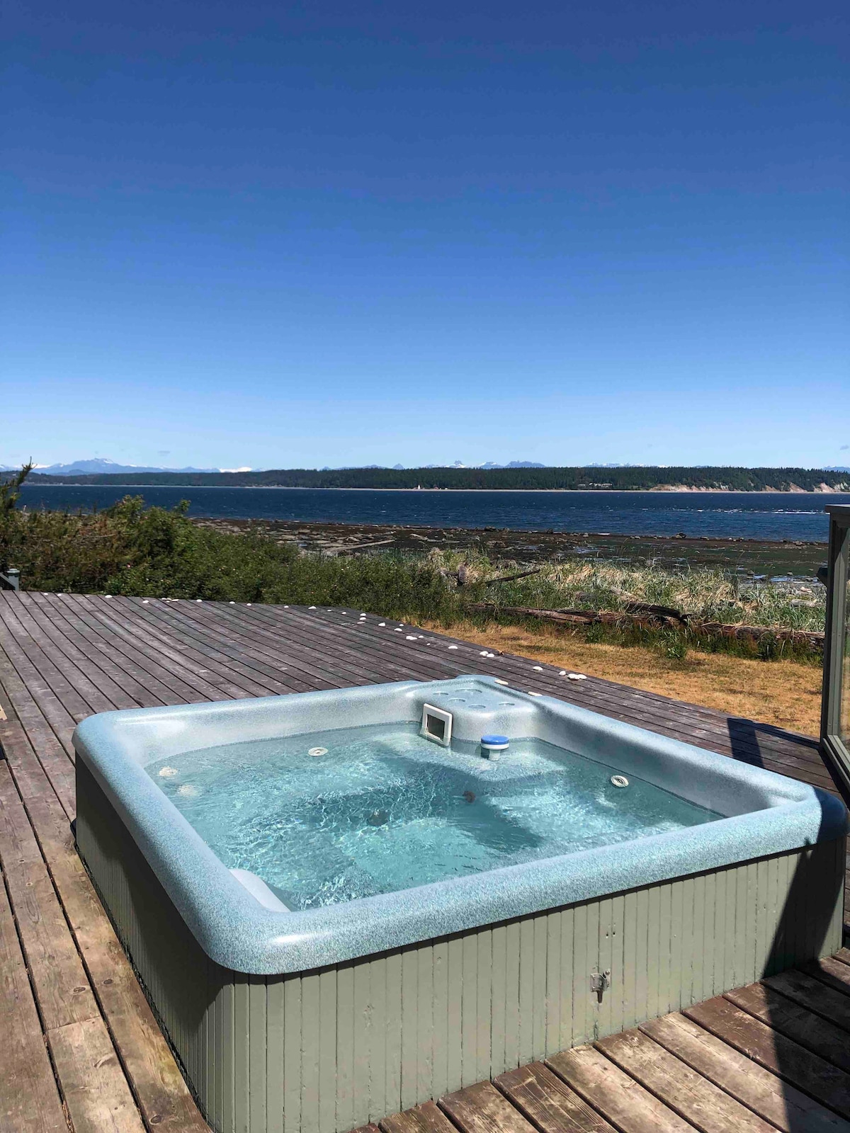 Take it easy overlooking our magnificent seascape setting. Great potential for spectacular pink, yellow, or indigo sunrises. Do a low tide walk along the sand bars or simply enjoy the panoramic view of the Spit and Estuary from the covered deck. Comfy outdoor seating has a great vantage to ocean goings on like eagles, geese, boats and float planes. We provide all you need for your stay to be comfortable. 5min to Elk Falls, the Campbell River, Ripple Rock hikes, 30 min from Mt. Washington base.
