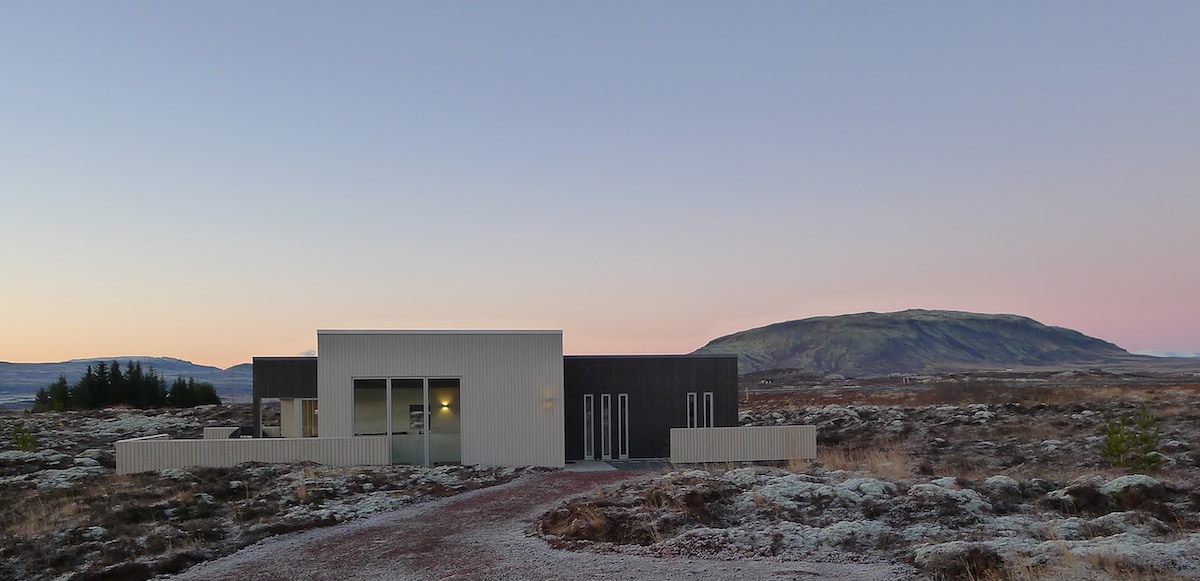 Discover serenity in our stunning lakefront cottage, boasting panoramic views of the tranquil lake and majestic mountains. With a rustic yet modern design, the cottage offers two beautiful bedrooms and two bathrooms (one is en-suite), and ample natural light. Enjoy waking up to the breathtaking Icelandic sunrise and pristine nature. Just 40 min from Reykjavik and 25 min from the Golden Circle, it's an ideal haven for travelers seeking peace. Registration number: HG-18303