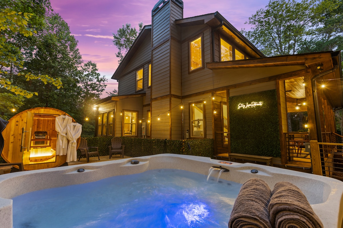 Top 1% on Airbnb. 4.98 rating, 177 reviews. Private hot tub, en-suite infrared sauna, fire pit, and a peaceful ridge 5 min from downtown Blue Ridge. Guests call this 2BR/2BA retreat restful, cozy, and private – it feels like home from the moment you arrive. The king suite opens to an infrared sauna steps from the bed. A second bedroom with full bath gives couples or a family room to unwind. Soak under the stars, grill on the deck, or explore wineries, hiking, and Lake Blue Ridge.