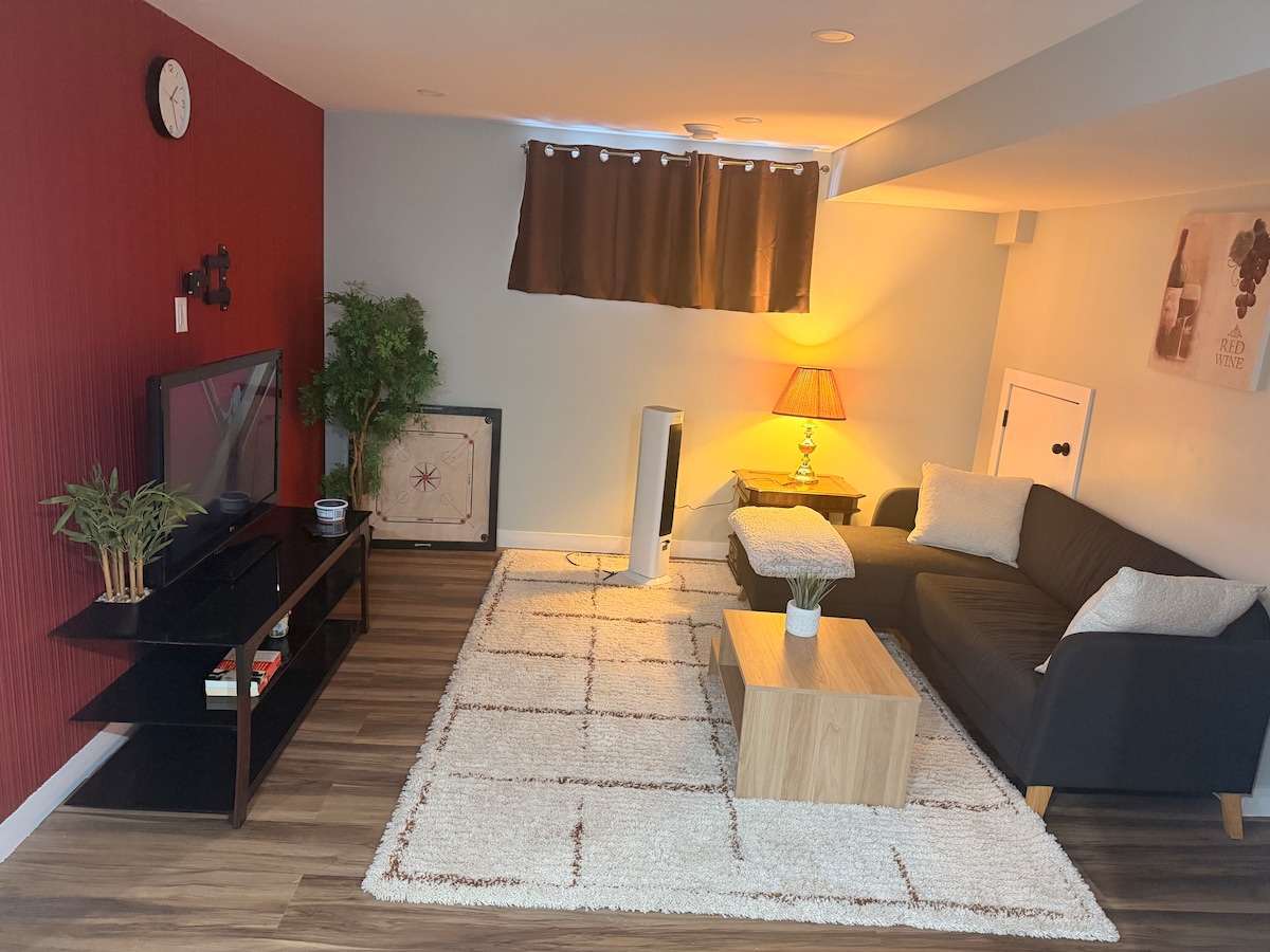 Welcome to my inviting Airbnb listing! Discover my one-bedroom basement suite with a private washroom, dining area, and living room. Enjoy a cozy retreat with a small working space table in the bedroom. Your privacy is ensured with a separate access door equipped with a keypad. The kitchen on the main floor is the only shared space, ensuring exclusive access to the basement amenities. Conveniently park up to two vehicles during your stay. Relax and unwind in this charming space!