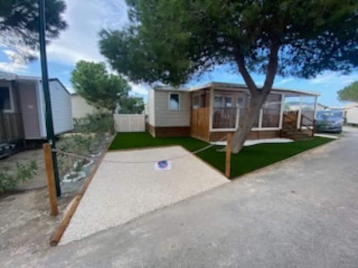 Mobilhome 3 chambres, 6 personnes 34m2, climatisation, lave vaisselle, grande terrasse couverte avec table et chaises, barbecue électrique, 2 vélos neuf mis à disposition, grand salon avec TV. (Lit bébé,chaise haute sur demande) Situé dans un camping très familial de 15 hectares à 1 km de Canet en Roussillon, 30 minutes de l’Espagne et un accès direct à la plage à quelques minutes, très nature à l'ombre des pins avec 2 grandes piscines dont un parc aquatique de 1500m2 chauffé dès avril.