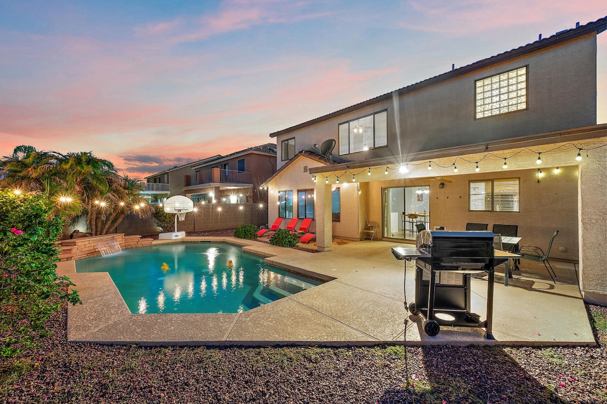 Escape to this luxurious 7,000 sq. ft. villa in Casa Grande, Arizona, perfect for families and group retreats. With 5 bedrooms, a private indoor and outdoor movie theater, a stunning heated pool with a slide, and ample outdoor entertainment options, your stay here promises fun and relaxation. Enjoy spacious living areas, gourmet kitchen, and a backyard oasis featuring a fire pit and outdoor kitchen. Experience the perfect blend of luxury and comfort for your unforgettable getaway!