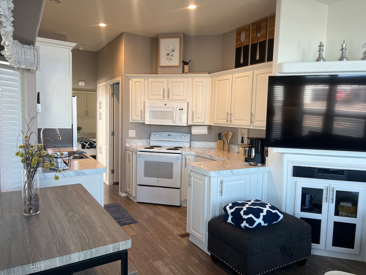Convenient location, landscaped back yard and vaulted living/dining area with Saltillo tile. Split floorplan with 2 BRs. Mstr BR has WIC, full bath, 55" smart TV, and workspace area with desk. Guest BR has closet w/storage, dresser, & 50" smart TV. Kitchen and bathrooms have quartz counters. Outdoor living space has covered & uncovered areas with patio furniture. Access to the community pool & hot tub with a green space. Dave White Golf Course and park are less than a 1 mile walk/bike ride.