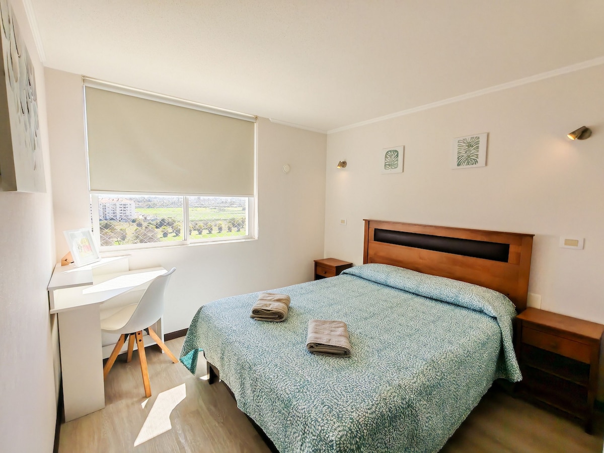 Disfruta de una excelente ubicación a una cuadra de la playa y a pasos del casino Enjoy. Cerca de restaurantes, cafeterías y bares ubicados en la costanera de La Serena. El condominio rodeado de áreas verdes, cuenta con piscina, quincho, estacionamiento, ascensor y conserjería 24 hrs. Completamente equipado, el departamento cuenta con 2 habitaciones, una con cama matrimonial y la otra adecuada como espacio de trabajo con escritorio. Sábanas y toallas incluidas. Smart TV y WiFi.