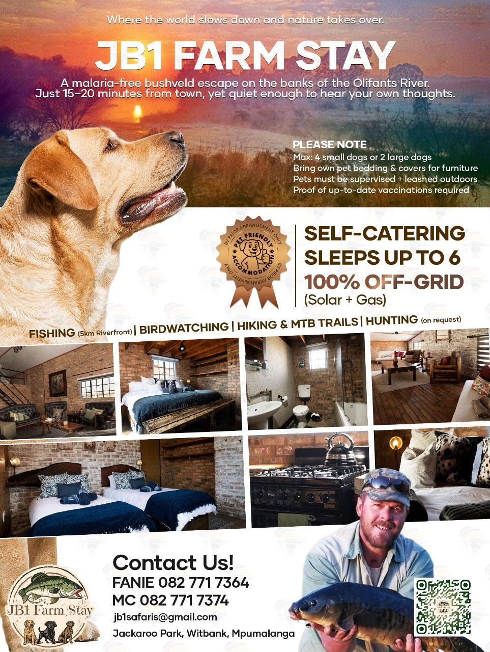 Escape the city in this spacious 4-bedroom farmhouse, located in a secure estate with free-roaming game. Perfectly positioned just 50 meters from the river, this home offers breathtaking views and unforgettable sunsets. For boating and fishing enthusiasts, the property includes a private jetty right in front of the house. Additionally, a communal slipway is just 150 meters away, making it easy to launch boats and water toys. Features: 4 Bedrooms Private jetty Communal slipway nearby (150m)