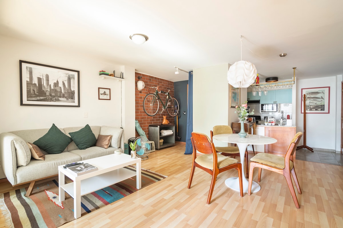 Experience Mexico City from this stylish loft in trendy Colonia Juarez. Perfectly located, walking distance from Roma Norte, Condesa, Zona Rosa, Polanco, and Reforma, it's ideal for couples, friends, families, and business travelers. Enjoy a spacious open-floor kitchen, living room, dining area, and large patio. With 24/7 security, high-speed internet, and easy access to public transportation, exploring the city is a breeze. Make this your comfortable and convenient home in vibrant Mexico City!
