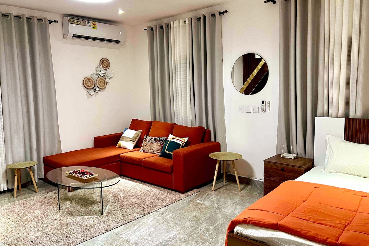 Discover a modern oasis in Accra! This stylish studio sits opposite the Ghana International Trade Fair, just a 12-minute walk to the beach and a 15-minute drive from the airport. Ideal for solo travelers, couples, or business professionals seeking a clean, stylish, and incredibly convenient base to explore the city. It offers a kitchenette, fast WiFi, A/C, water heater, smart TV, outdoor seating, and parking. Enjoy comfort and convenience in a friendly environment!